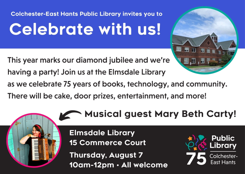 Invitation to attend another branch celebration for the Colchester East Hants Public Library 75th anniversary at the Elmsdale Library on Thursday, August 7th from 10 am – noon. All Welcome!