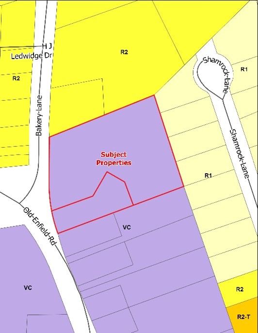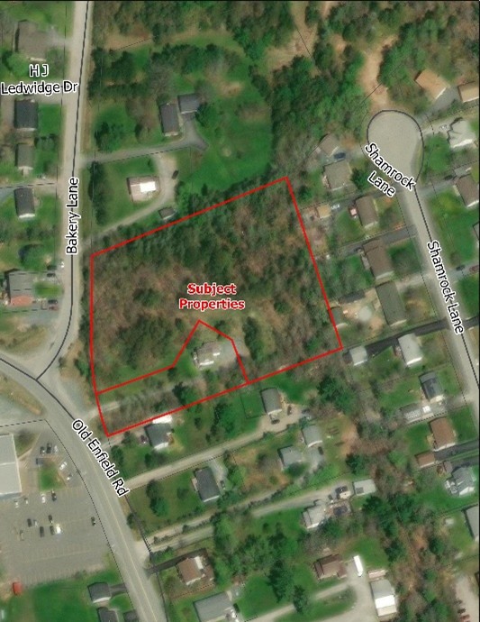 The total area of the subject lands is approximately 1.13 ha (2.8 acres). The properties are currently zoned Village Core (VC) Zone. Property to the south is zoned Village Core (VC) Zone, property to the north is zoned Two Dwelling Unit Residential (R2) Zone, property to the east is zoned Established Residential Neighbourhood (R1) Zone, and across the Old Enfield Road is the Royal Canadian Legion, which is zoned Village Core (VC). The subject lands have frontage on the corner of Old Enfield Road and Bakery Lane.
