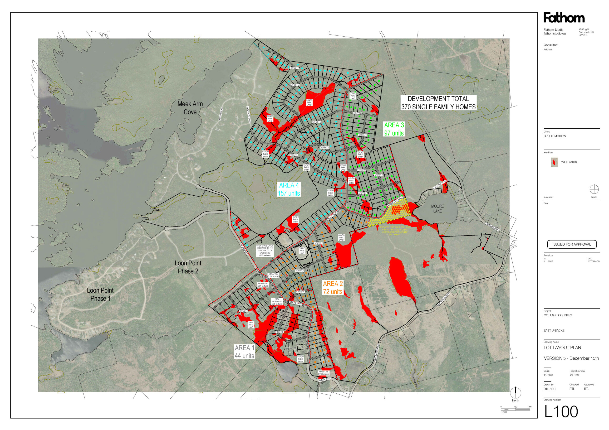 The purpose of this application is to enter into a development agreement to permit a 370 dwelling unit bare-land condominium development with 10.19 hectares of multi-use development (commercial & residential live/work units). The plan shows the 370 dwelling units and the multiple use lands divided into four (4) different condo villages. All condo units will be on average over 0.4 hectares (1 acre) in size to accommodate onsite services. There is one parcel of land that the applicant has requested be removed from the terms of the development agreement. It is indicated in yellow on the site plan. Also shown on the concept plan are four (4) areas of mixed-use development (commercial and low-density residential), for a total of 10.19 hectares. These areas all have frontage along Nature Drive. Below is a list of commercial uses that could potentially be included in the development agreement: • Animal Hospitals & Veterinary Offices • Commercial Club • Daycare, General • Educational Services • Health Care Services • Office & Professional Services • Personal Care Services • Recreation Facility, Indoor • Restaurant, Full & Limited Service • Restaurant, Take-Out • Retailers & Rental Services • Social Enterprise • Institutional (IU) Zone Uses At the request of the Parks, Recreation and Culture Department, the Developer is proposing an 8.25-hectare open space parcel of land with frontage along Nature Drive and the new proposed public road. The land is sufficiently large to provide the greater East Uniacke community with a variety of recreational amenities as the area continues to develop. The proposed land contribution represents just over 50% of the required open space contribution; the remaining open space contribution will be provided as cash-in-lieu. Private roads within the condo corporation are proposed to be constructed to Municipal standards for private roads. Staff have requested that the current emergency exit to Long Lake Road be upgraded to a Municipal Road to allow for a second public road to service the potential 771 dwelling unit owners and commercial operators. Together with the existing Cottage Country development, there are proposed to be 771 bare-land condominium units as part of the development, for an approximate future population of 1,850 residents.