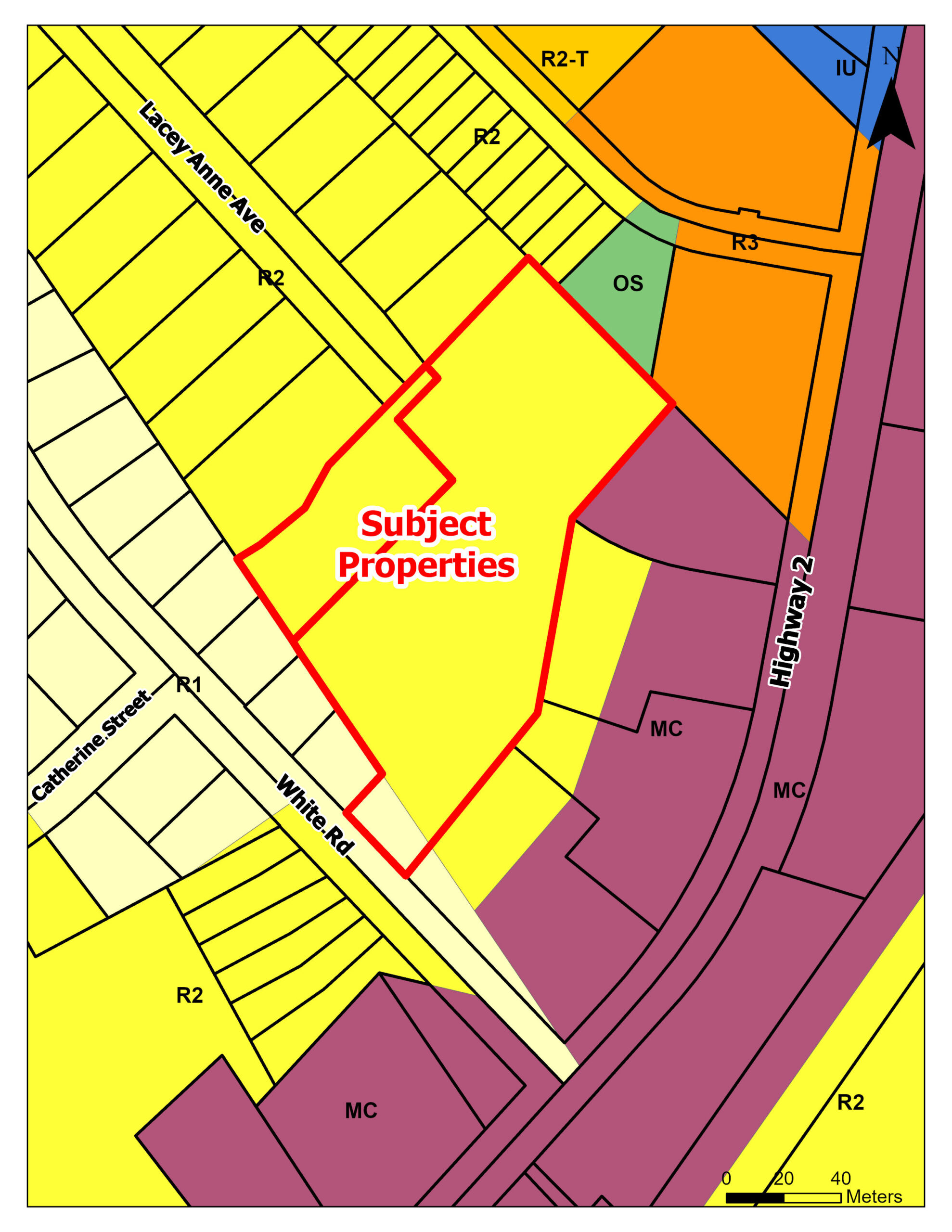 The subject properties are located off of Lacy Anne Ave and White Road in Enfield (PID 45329901 and PID 45379864). The two properties are approximately 1.4 hectares (3.68 acres) in size with frontage along Lacy Anne Ave and White Road. The land is designated as the Established Residential Neighbourhood (ER) and zoned the Two-Dwelling Unit Residential (R2).