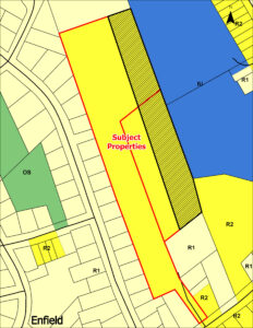 The subject properties are located at PIDs 45235843 and 45235835, Dorey Lane, Enfield. The application relates to portions of these two properties and are identified by the hatching on the zoning map. The properties are currently designated Established Residential Neighbourhood (ER) Designation and are zoned Two Dwelling Unit Residential (R2).